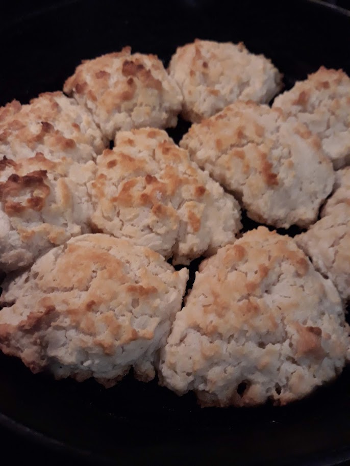 - Once butter is melted in iron skillet, drop heaping spoons of dough into the melted butter forming individual biscuits. I usually make around 9 large biscuits.