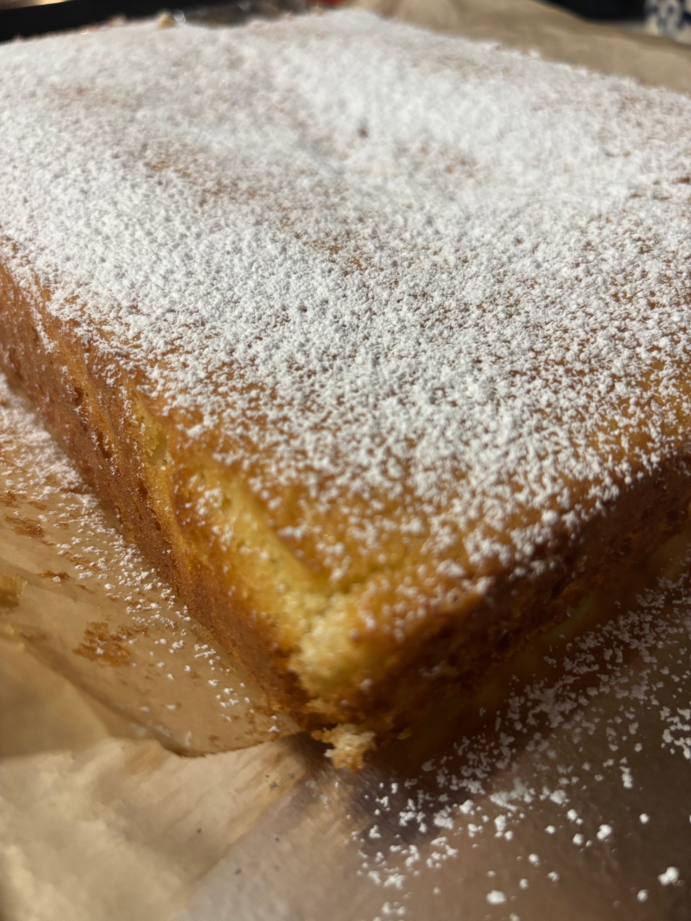 - Bake for 28 to 32 minutes or until lightly browned, and a toothpick inserted in the center comes out clean. Let the cake cool completely in the pan on a wire rack. Dust the cake with powdered sugar before slicing and serving.