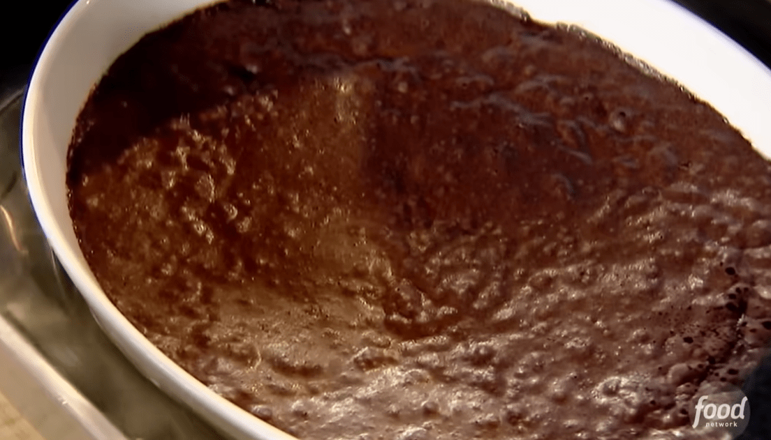 - Pour the brownie mixture into the prepared dish and place it in a larger baking pan. Add enough of the hottest tap water to the pan to come halfway up the side of the dish and bake for exactly 1 hour. A cake tester inserted 2 inches from the side will come out 3/4 clean. The center will appear very under-baked; this dessert is between a brownie and a pudding.