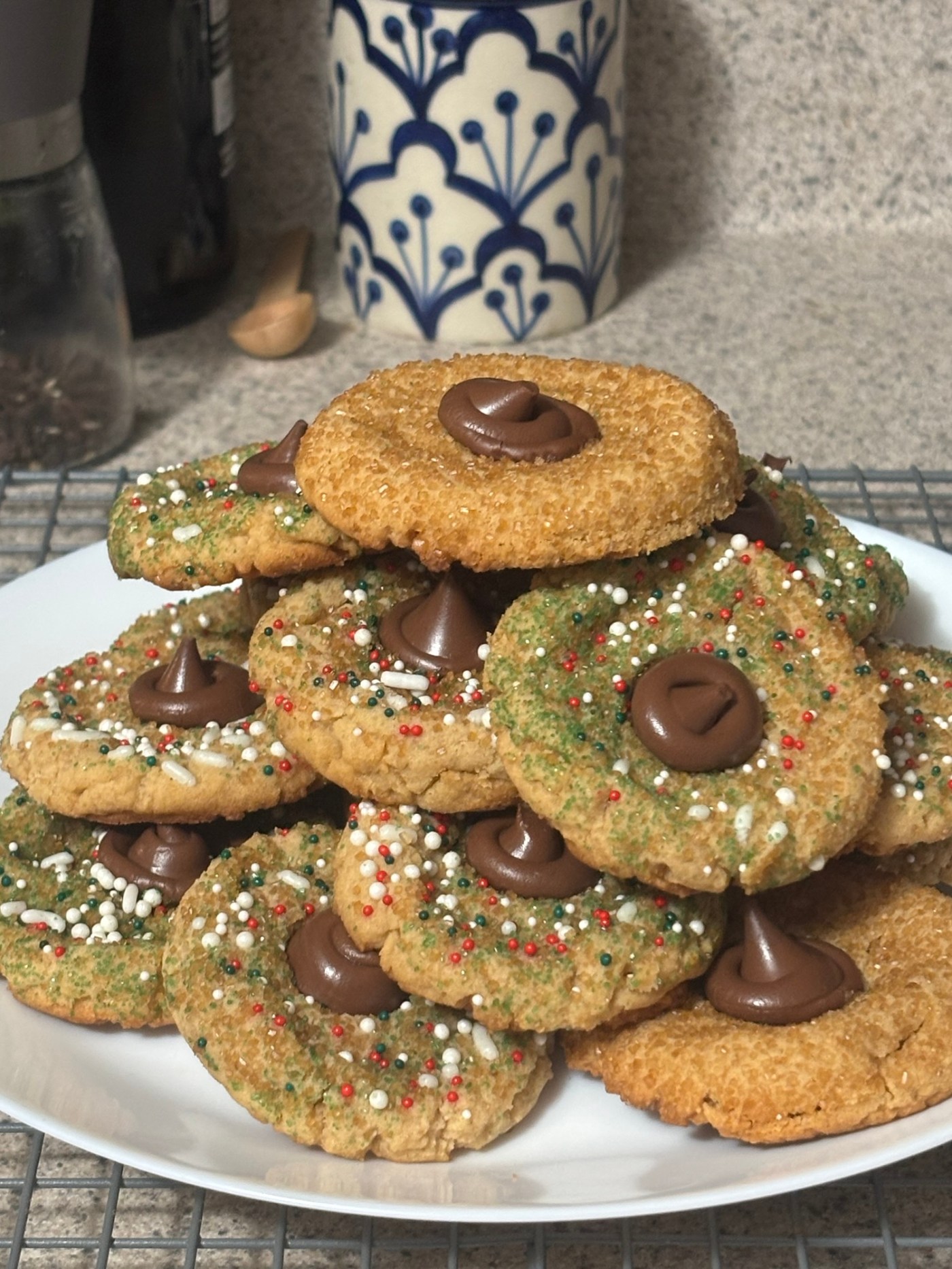 When making Peanut Butter Buttons, I like to press the tip of the Hershey Kiss into the cookie once slightly melted. This helps with stacking for storage. And while sprinkles are always a favorite for special occasions, my favorites will also be rolled in turbinado sugar instead.